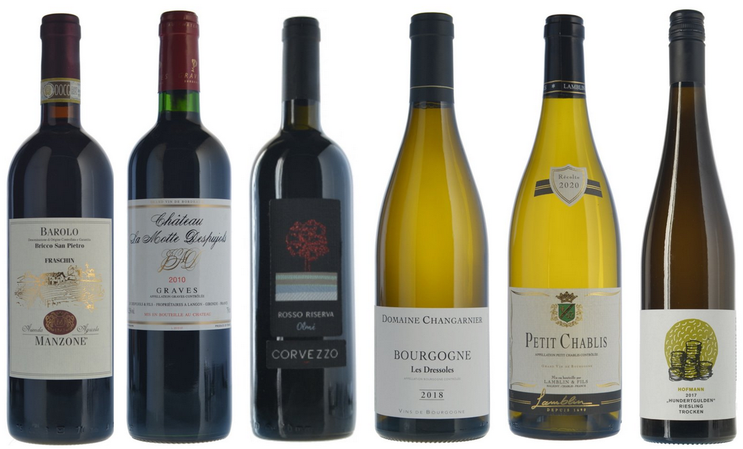 Totalt ingår sex flaskor, där det röda Chateau La Motte Despujols Graves från 2010 inleder. Bordeaux är Frankrikes största vinregion när det gäller produktion av kvalitetsvin, och denna är då rakt inget undantag! Manzone-producenten San Pietros Barolo är nästa anhalt, där i nordvästra Italien, alltid gjord på Nebbiolodruvan och lagrad i minst 38 månade såklart. I vinkretsar är den till och med mångas favorit; och till rätt mat, gärna rejäla kötträtter, bär den lätt som en sommarmorgon en till ljuvliga smakplatser. Bordeuax på Italienvis då? Ja, då blir det Corvezzo Veneto Rosso IGT 2015, som tillverkas om man tar sig vågrätt rakt över landet från nämnda Barolodistrikten, i Veneto nära Venedig. Gjort på den ovanliga druvan Raboso, vilken ger djupt färgade drycker och äger höga halter av tanniner.
